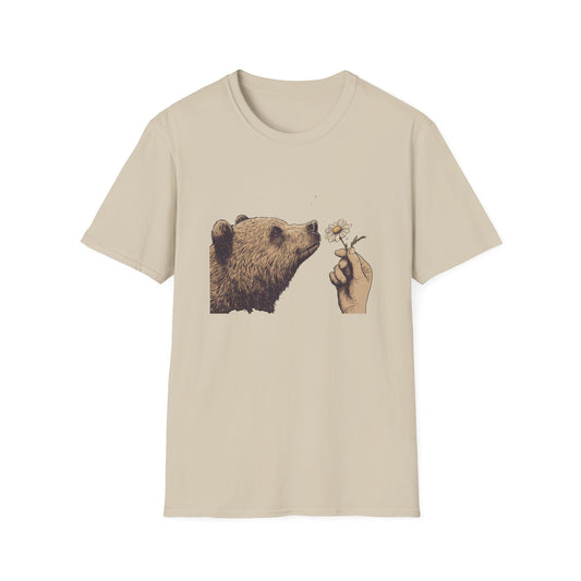 Wild Encounter Bear T-Shirt, Curious Grizzly Shirt, Nature Lover Gift, Sniffing Wildflower, Minimalist Wildlife Tee, National Park Shirt